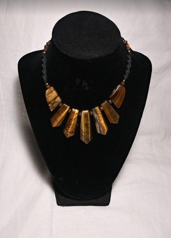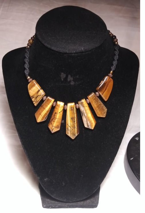 Our beautiful Macrame and Gemstone necklace is perfect for both Formal events and Casual, everyday use. The black, twisted cording gives an elegant contrast to the bright golden Tiger Eye stones, and the accenting copper and golden colored beads brings the whole piece together.