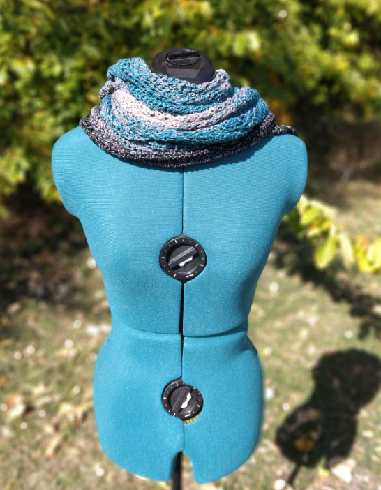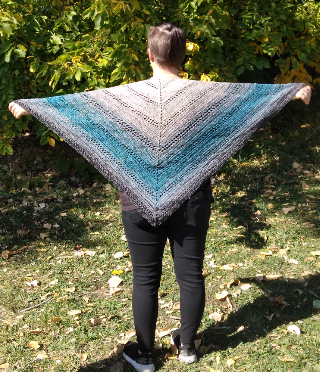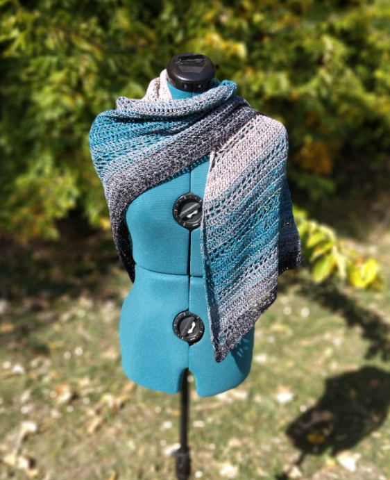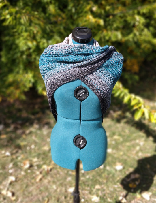 This draping, lightweight shawl is perfect for Spring and Summer apparel and features a light-to-dark ombre consisting of Tan, Grey, Blue, and Black. Can be used as a Shawl and a decorative scarf.