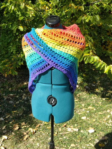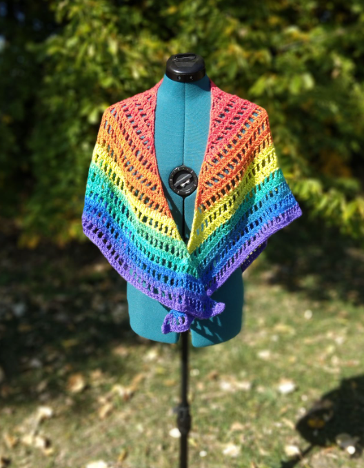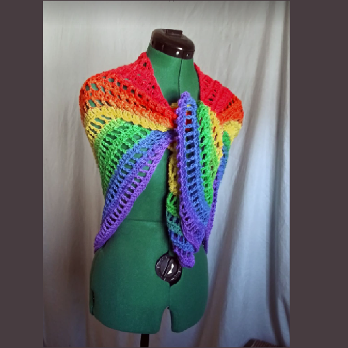 This brightly colored shawl is perfect for casual attire, light enough to be worn during warmer weather, and a cute way to show your Pride!