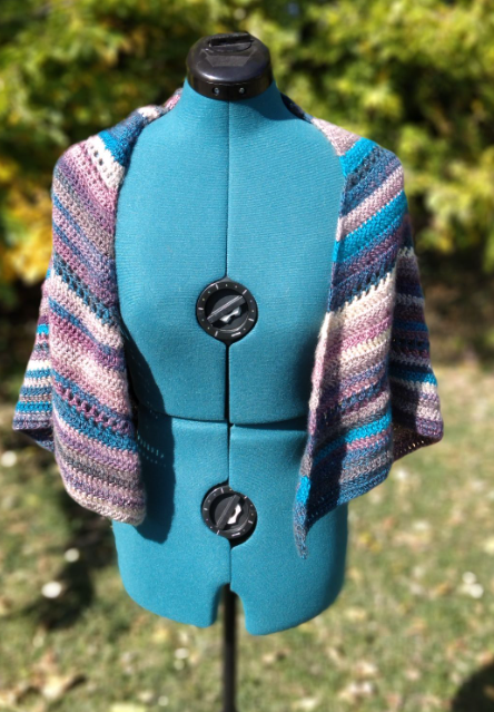 This shawl features a gorgeous combination of various shades of blue, pink, purple, and tan, resembling the colors of the beautiful Rainbow Fluorite crystal.